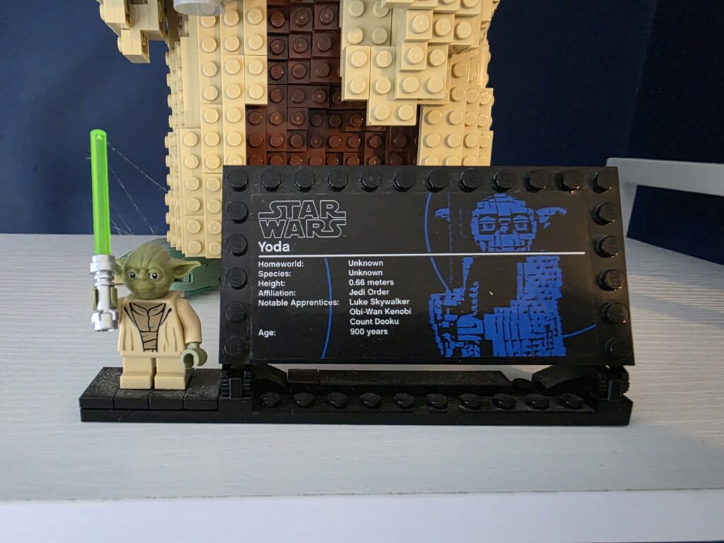 The posable head, articulated eyelids, and even movable eyebrows allow you to give him a range of expressions, from deep in thought to a mischievous twinkle in his eye. His fingers can be posed to grip his green lightsaber, hinting at the powerful Jedi warrior within. The final model is substantial, with a satisfying weight and presence on the shelf. Included in the set, as is standard for these Ultimate Collector Series-style builds, is an info plaque and a fantastic little Yoda minifigure, making the whole package feel like a premium collector’s item.