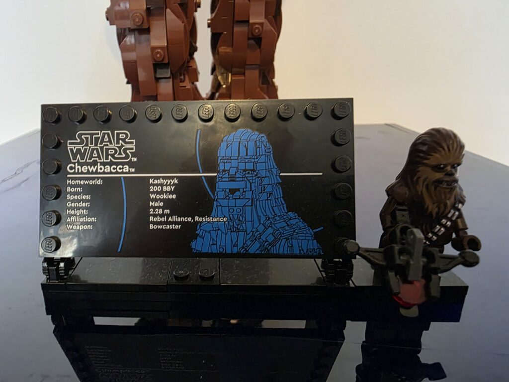 The set also includes a fantastic information plaque and a dedicated stand for the exclusive Chewbacca minifigure, making it a perfect, complete collector’s piece.